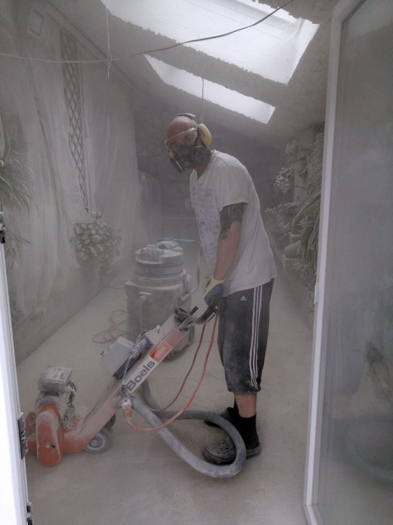 Nach dem Entfernen der Polygonalplatten mussten die Reste der Steine und des Klebers gefräst werden.