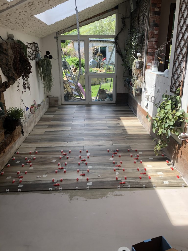 700kg (28 Säcke) Ausgleichsmasse später war der Boden eben und es konnte mit dem Fliesen begonnen werden.